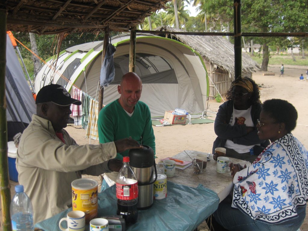 Agy (außen links) und seine Frau Olga (außen rechts) von MAHLAHLE zu Besuch in unserem Buschcamp in Guigobane 2010. Hier: Besprechung mit Maestro Christoph und Mama Joaquina! Unser Camp befindet sich übrigens mitten auf dem Schulhof – die Kinder hatten Ferien!