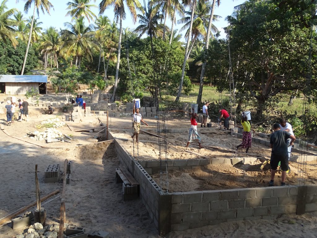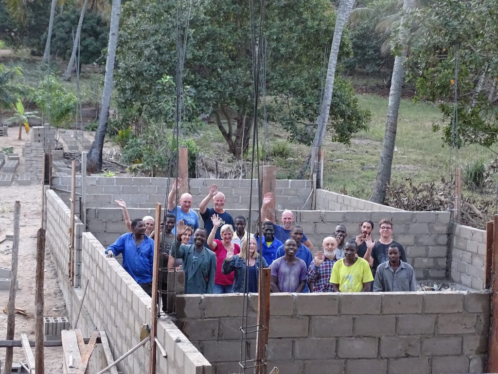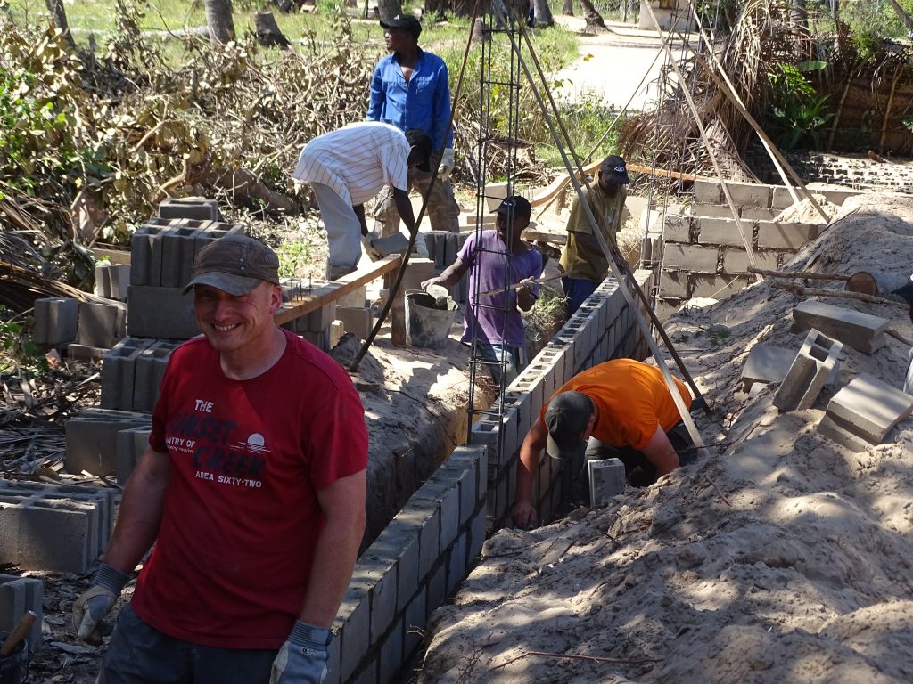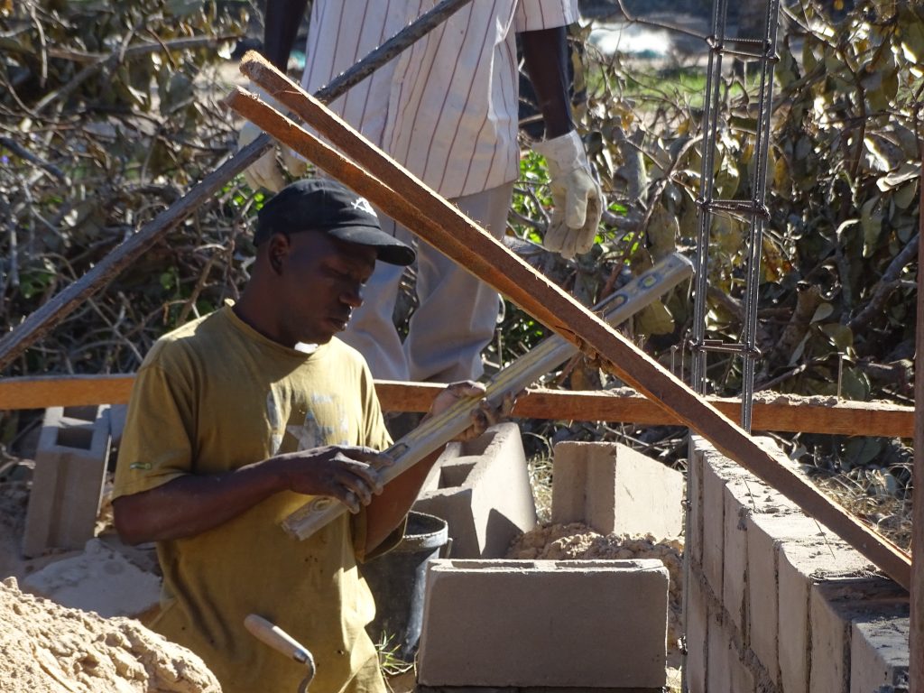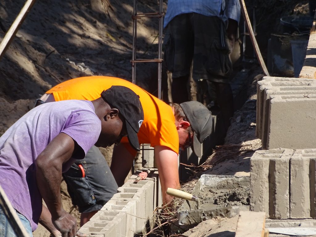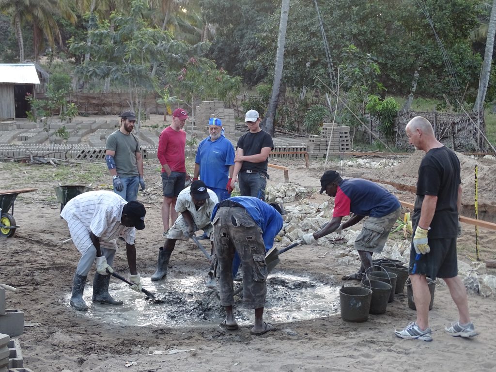 „Ebony and ivory work together in perfect harmony …!“, könnte man die Bauphase perfekt beschreiben. Aber das hatte sich ja schon 2010 bewährt. Offensichtlich gibt es auf Baustellen eine Art der Kommunikation, die ohne viel Sprache auskommt und funktioniert. Die von uns mitgebrachte Wasserwaage bedarf natürlich einer speziellen Einführung. Und wir sind umgekehrt erstaunt, wie man Beton ohne Betonmischer anrührt.