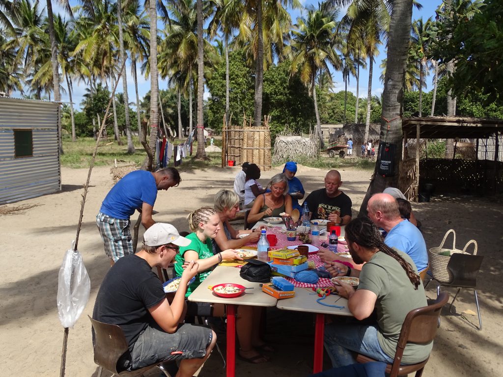 Dank unserer Initiative, eine Schule und einen Brunnen zu bauen, ist Guigobane von der mosambikanischen Bildungsbehörde zum Schulzentrum mit hauptamtlichem Schulleiter und fest angestellten Lehrern erkoren worden – ein weiterer Grund, den Bau eines zweiten Schulgebäudes voranzutreiben. Direkt via à vis der Schule errichtete man ein Camp für uns. Tolle Ausstattung dieses Mal: mit Küche, Klohäuschen und Duschkabine. Fehlten nur noch unsere Zelte. Aus den Schultischen bauten wir in unserem Outdoor-Esszimmer eine Tafel.