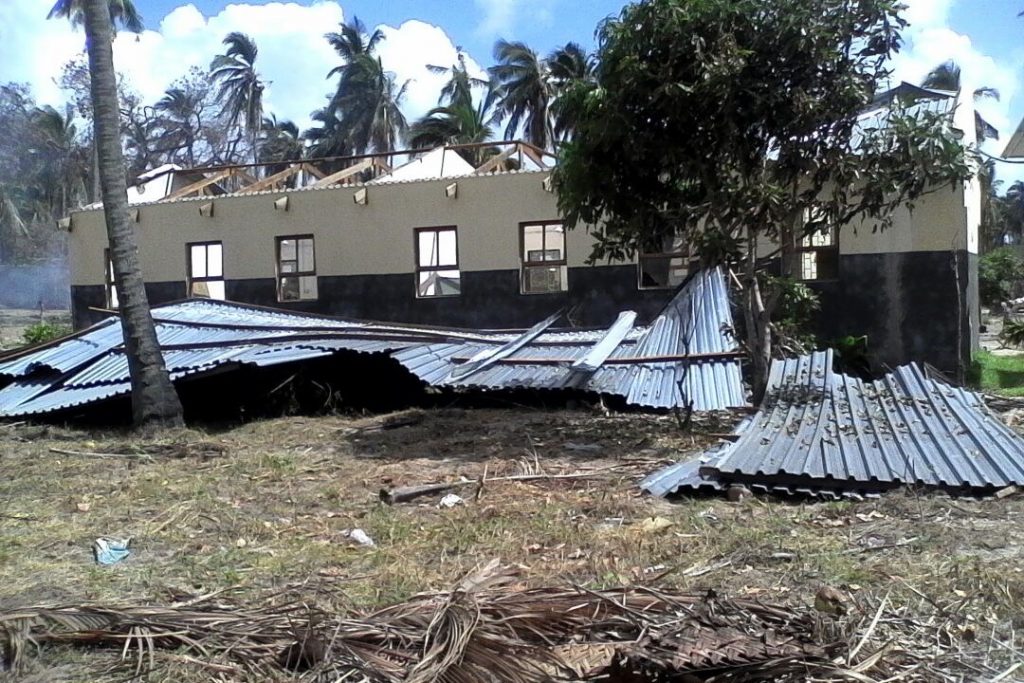 2017 richtet ein Tropensturm entlang der Küste im südlichen Mosambik schwere Schäden an. Auch unser Schulgebäude ist betroffen: Das Dach wird vom Winde verweht und Fensterscheiben gehen zu Bruch. Wir lassen unseren Partnern vor Ort Geld für die Restaurierung zukommen.